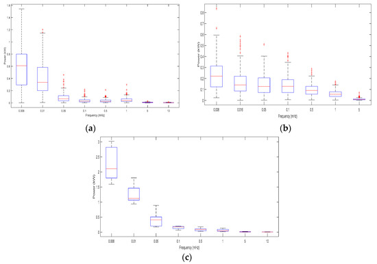 Figure 7 illustrates the annual statistics of the HVAC, WH, and refrigeration systems’ power consumption frequency contents. It is observed that most of the power consumption lies at frequencies less than 10 mHz that correspond to the low and medium frequency bands of the PV generated power. In addition, it can be observed that the dispersion from the medians is quite large for the HVAC and WH systems, while it is moderate for the refrigeration systems.
