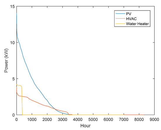 Now, we want to employ the concept of the load duration curve in [30], which is used to show the relative relation between the power capacity load utilization and the power generation capacity requirements. The load consumption data in a load duration curve are not ordered chronologically as in a typical load curve, rather they are ordered in a descending order of magnitude. This concept is employed in this study to understand the relative relation of the demands of HVACs and WHs to the solar PV generation over a one-year period. This will determine the power consumption over a year, and then we can relate this information to the solar PV generation.