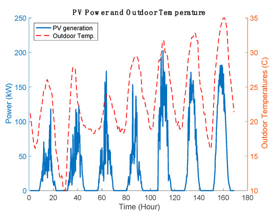 One week of Solar PV power and outdoor temperature profiles.