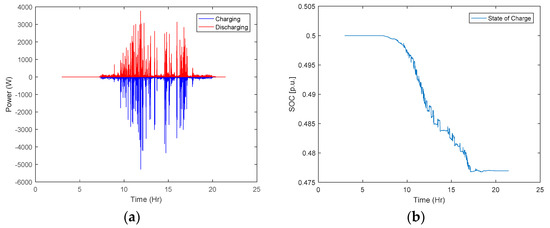 (a) Charging/discharging power levels and (b) state-of-charge (SOC) of the battery.