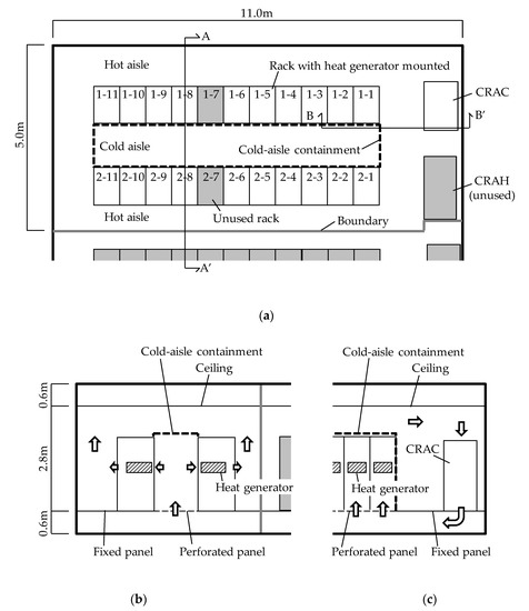 The verification room simulating a data center is shown in Figure 1, and the specifications of the experimental equipment are detailed in Table 2. The rack layout in the verification room is a cold-aisle/hot-aisle type, and the cold aisle is fitted with cold-aisle containment (CAC) that surrounds with horizontal components that pass over the racks. At the center of the verification room (hot-aisle part), the room, raised floor, and ceiling are divided by temporary partitions (antistatic flameproof films), and the target range of verification room is 11.0 m long and 5.0 m deep. Of the 22 19-inch racks, 20 racks are equipped with one heat generator with a 2-kW heater, and the other two (unused) racks are blocking the door side of the racks. The heat generators (with height of 6U) are installed at heights of 23U to 28U from the rack bottom.
