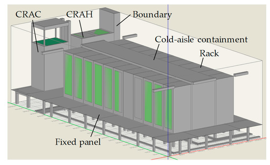 In data centers, information-technology equipment (ITE) expends an enormous amount of electricity on information processing. Data centers are thus known as facilities that consume huge amounts of electricity. In fact, it is estimated they account for 1% of global electricity consumption [1]. Although, almost all the power consumption of the ITE in a data center is converted into sensible heat, the failure rate of the ITE increases as its inlet temperature increases [2]. From the standpoint of preventing “information-communication stagnation” due to failure of ITE, the ITE is therefore cooled 24 h a day, 365 days a year. As an operational target for cooling, the thermal guidelines [2] presented by the American Society of Heating, Refrigerating, and Air-Conditioning Engineers (ASHRAE) TC 9.9 are often cited. As for a data center, heating, ventilation, and air-conditioning (HVAC) consumes 30–40% of the energy of the whole facility [3]. Accordingly, better energy conservation is strongly demanded. Especially in the case of a data center, fans consume a large amount of power because the sensible-heat load of the housed ITE is processed with a large volume of air, which accounts for about 26% of the power consumption of the HVAC [4]. For that reason, improving the efficiency of air-conditioning airflow has been actively researched.