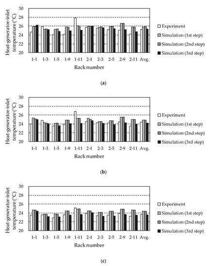 Reproducibility of the actual inlet temperature of a heat generator is confirmed as follows. The measurements and simulation results of heat-generator inlet temperature for each rack when CRAC fan frequency was varied [45 Hz (G1), 54 Hz (G2), and 63 Hz (G3)] are plotted in Figure 6. Each step of the simulation is considered first. The simulation results of the first step and those of the second step show no significant difference under any CRAC airflow conditions. Next, compared to the first and second steps, the third step reveals that the heat-generator inlet temperature decreased, especially in the racks far from the CRAC, namely, racks 1–5 to 11 and 2–5 to 11. It is considered that the reasons for this result are twofold: (i) there is no bypass air flowing from inside of the raised floor to the hot aisle via the gap in the fixed panels and (ii) sufficient air-conditioning air supply passed through the perforated panel in the raised floor.