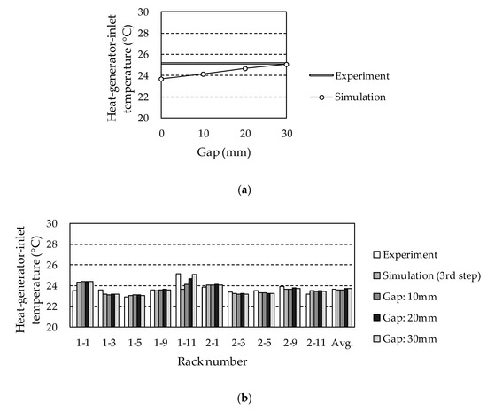 Next, the simulation results of the third step after parameter tuning are compared with the measurements. As for the first row of racks, although deviations in temperature of 1 to 1.5 °C and 3 °C exist for rack numbers 1-1 and 1-11, as for the other racks, the experimental measurements could be roughly reproduced. Also, as for the second row, the experimental measurements could be predicted accurately. Rack number 1-11 shows large deviations, which suggest that a factor that not reflected in the CFD model is increasing the heat-generator inlet temperature. Under the assumption that there is a gap in the part where the vertical member of the CAC and the rack number 1-11 contact, the results that reflect this gap in the CFD model for CRAC fan frequency of 63 Hz (G3) is shown in Figure 7. As for the result of changing the gap in intervals of 10 mm, when the gap was 30 mm, the simulated heat-generator inlet temperature of rack number 1-11 was close to the measured value. Also, the assumed gap did not adversely affect the prediction results of other inlet temperatures.