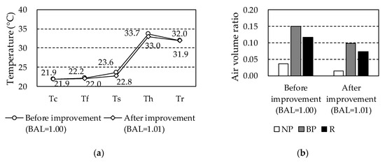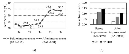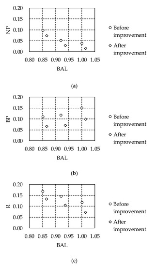 The possibility of energy reduction by improving heat-insulation performance is considered as follows. To make it easier to see changes in each index due to varied CRAC fan frequency, Figure 8, Figure 9 and Figure 10 are rearranged as Figure 11. BAL on the horizontal axis of Figure 11 is the ratio of CRAC air volume (mc) to ITE air volume (ms), as given by Equation (5), and BAL increases as CRAC air volume increases. As BAL increases, NP decreases, BP increases, and R decreases. It is considered that NP decreases and BP increases because the larger the BAL, the more air is supplied to the raised floor. Similarly, it is considered that R decreases as a sufficient amount of air is supplied to the cold-aisle containment (as BAL increases). In both cases, each index is lower after the improvement than that before the improvement within the range of the CRAC-airflow conditions used in this study.