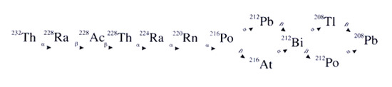 It is known that in the averaged composition of the Krasnoufimsk monazite sample, there is not only up to 67% of the sum of high-priced rare-earth oxides, but also 6.9% of thorium oxide ThO2 and 0.18% of uranium oxides (Table 1). Thus, the initial mineral raw material is a radioactive material containing alpha emitters (232Th, 235U, 238U) and their decay products (228Th, 224Ra, 226Ra, 212Bi, 220Rn, 222Rn, and 212,214,216,218Po), some of which are gamma-active (228Ac, 212,214Bi, 208Tl, 212Pb). The chain of radioactive transformations of 232Th is shown in Figure 1 diagram below: