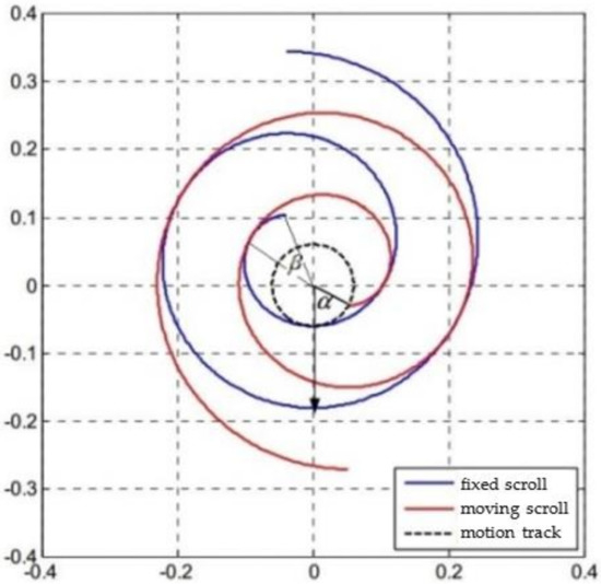 In Figure 1, indicates the angle between the head of the moving scroll and the negative direction of the y-axis, and the current position of the expander is represented by . If the initial position of the moving scroll head is , the moving scroll vortex curve equation is: