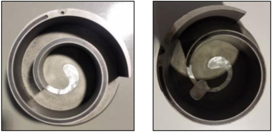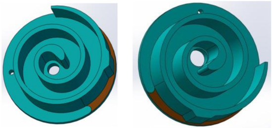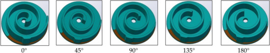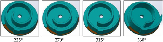 To research the influence of the intake chamber wall on the exergy efficiency of the scroll expander, the cutting angle of the intake chamber head of the scroll wall is, respectively, 45°, 90°, 135°… 360° resection, as shown in Figure 6. Some processed objects are shown in Figure 7.