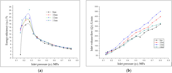 The original inlet diameter of the expander is 8 mm. Therefore, the inlet size of the expander is taken as 8, 10, 12, and 14 mm. The experiments were conducted separately. The effects of the inlet port size on the performance of scroll expander are shown in Figure 5. Figure 5a shows that, when the inlet pressure is 0.27 MPa, the exergy efficiency of the scroll expander is the highest. With the increasing of the intake pressure, the exergy efficiency gradually decreases, and the decreasing rate gradually decreases. When the inlet pressure is kept constant, the exergy efficiency of the scroll expander gradually increases as the inlet expands. When the inlet diameter of the scroll expander is expanded from 8 to 14 mm, the overall exergy efficiency of the scroll expander is increased by about 2%. Therefore, the exergy efficiency of the scroll expander can be improved effectively by expansion of the inlet size, especially when the intake pressure is below 0.3 MPa. When the inlet pressure is 0.27 MPa, the exergy efficiency can be increased by about 6%. When the inlet pressure is greater than 0.3 MPa, the effect of the inlet port size on the exergy efficiency of the expander is poor, only ranging from 1% to 2%. This is because of the limited expansion of the inlet port size. For the higher pressure, the smaller change in the size of the air intake has less effect on the intake air volume.