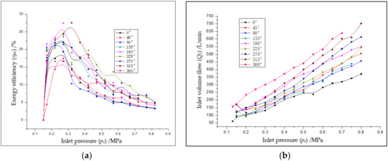 The effects of the cutting angle of the scroll in the intake chamber on the exergy efficiency at different inlet pressures are shown in Figure 8, where, according to the effect of the air inlet size on exergy efficiency, the air inlet port size in the experiment is 14 mm. Figure 8a shows that the cutting angle has less effect on the exergy efficiency with the increase of the inlet pressure. When the inlet pressure is 0.28 MPa, the maximum exergy efficiency of the scroll expander is increased by about 8% at the angle of 180°. When the inlet pressure is greater than 0.3 MPa, the exergy efficiency of the scroll expander decreases significantly with the increase of the inlet pressure, which is reduced from an increase of 8% to about 2%. This shows that the influence of the 180° resection of the intake chamber head on the expansion exergy efficiency of the expander is more effective at the low pressure. When the intake pressure is between 0.3 and 0.4 MPa, the highest efficiency point of the expander is caused by 315° cutting the head, the exergy efficiency of the expander is increased by about 12.5%, and the corresponding intake pressure is 0.32 MPa. This is caused by two reasons: (1) the same expander is used in this group of experiments, and after several times of dismantling and processing the leak of the expander is increased; and (2) the contact area at the wall end of the movable and fixed scroll is reduced, and the internal leakage is increased for the removal of the wall head of the intake chamber. When the inlet pressure is greater than 0.4 MPa, it can be clearly observed that the improvement rate of the exergy efficiency is greatly reduced, and the minimum increase is about 2%. Within this range of intake pressure, the most improvement of the exergy efficiency of the turbo-expander is caused by the 225° angle of the wall head resection, which is increased by about 10%.