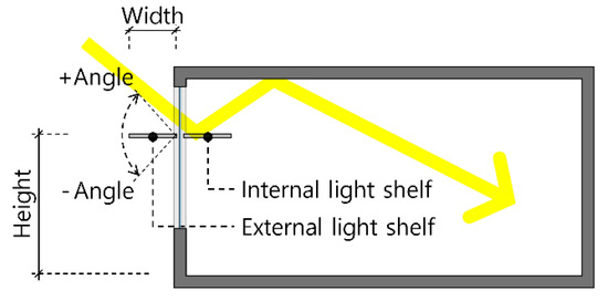 As shown in Figure 1, a light shelf is a typical natural daylighting system that is installed on a window to introduce natural light from outside the window deep into the room using the reflector of the light shelf and the surface of the ceiling. Light shelves can save lighting energy by introducing external natural light into rooms and also can resolve unbalanced indoor illumination by blocking excessive natural light from the window. The variables that determine the daylighting performance of light shelves include the width, reflectance, height, and angle of the light shelf, and, as shown in Figure 2, controlling the light-shelf angle makes it easy to cope with external environmental factors. In particular, movable light shelves provide advantages such as the ability to change the shelf’s angle, and various studies have been conducted by applying such techniques [12]. However, controlling movable light shelves requires additional energy, so optimal designs need to be applied to deal with related issues. Light shelves are classified into external and internal light shelves depending on the installation location [14]; external light shelves have better daylighting performance than internal light shelves [18], however, there are issues related to damage and maintenance since they are installed on the outside [17].