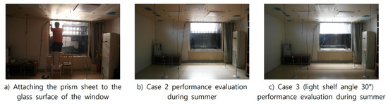 First, the optimal angles for Case 1 (external light shelf with no prism sheet) to save lighting energy and improve indoor light uniformity during summer, mid-season, and winter were 30, 20, and 10°, respectively. Considering this, Case 1 requires a means of changing the light-shelf angle. Although movable-type external light shelves can improve daylighting performance by responding to external environments such as the solar altitude, the use of additional energy to move the light shelf may reduce the impact in terms of saving building energy. Adding a driving unit to operate or move the light shelf will also lead to complex structures and maintenance difficulties.