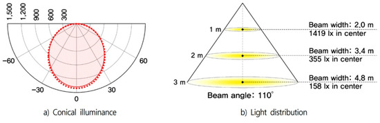 Conical illuminance and light distribution of lighting.