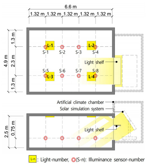 For this study, a full-scale testbed was built based on a related study [25] as shown in Table 6, and the details are given as follows: The size of the testbed was 4.9 m × 6.6 m × 2.5 m, and the reflectance was set to 86%, 46%, and 25% for the ceiling, wall, and floor, respectively. The size of the window where the light shelf was installed was 1.9 m × 1.7 m, and the transmittance of the glass was 80%. Four LED-type lights with eight-level dimming control were installed according to the IES four-point method [21] to derive the amount of lighting energy used to maintain the optimal indoor illumination. Figure 5 shows the light distribution curve and the conical illuminance of the lighting that was used to evaluate the performance. An artificial solar irradiation apparatus was also installed outside the window where the light shelf was installed to evaluate the performance under various external environments. As shown in Figure 6, the artificial solar irradiation apparatus enabled us to simulate the sun by controlling the intensity, height, and angle of the artificial light source. This Grade-A apparatus ensured measurement uniformity in accordance with ASTM E927-85 [25], so it was able to obtain valid results between performance evaluations. However, the mechanical characteristics of this apparatus meant that it could only be used to evaluate the performance when the sun was facing south since it was impossible to simulate the solar azimuth. As shown in Figure 7, eight illuminance sensors (precision: ±3%) were installed to collect the illuminance information of the indoor space. Finally, an energy monitoring system was used to monitor the energy used by the lighting devices.