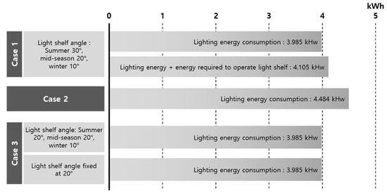 Third, the optimal light-shelf angles for Case 3 (with prism sheet) during summer, mid-season, and winter were 20, 10, and 10°, respectively, as shown in Table 8. Based on this, the amount of lighting energy used to maintain the optimal indoor illuminance was 3.985 kWh.