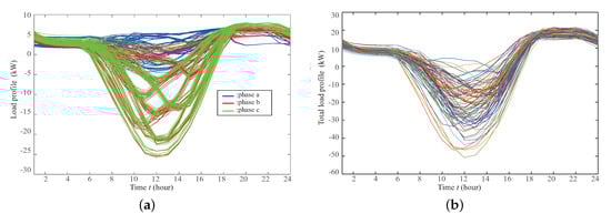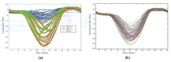 In order to assume uncertainty and realistic situation, the load is selected from representative clustered real load data. The load is roughly divided into both commercial and residential areas and randomly selected from the prepared clusters. Table 2 presents unbalanced introduction rates of load and PV power based on the c phase of the randomly selected load profile. In Table 2, , , and are data type extracted by mean clustering.