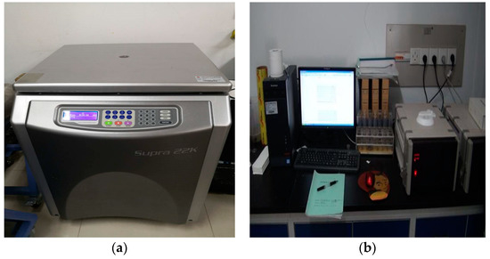 Experimental apparatus used for measuring movable water saturation: (a) High speed centrifuge; (b) Nuclear magnetic resonance (NMR) detector.