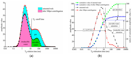 NMR measurement is a powerful, nondestructive analytical technique which can obtain reservoir parameters such as porosity, permeability, irreducible water content and other parameters that characterize the reservoir [24,25,26,27]. In this study, the main steps to determine movable water saturation were as follows: First, the T2 cutoff value of the experimental core was determined using a combination of nuclear magnetic resonance and the centrifugation technique. After comparing the original water saturation with that after centrifugation at different centrifugal forces, 300 psi was determined to be the centrifugal force corresponding to the original water saturation of the Sulige tight sandstone reservoir. Thus, the water state after centrifuging the saturated core at 300 psi represented the initial state of the reservoir core. From the corresponding NMR T2 spectrum line after centrifugation at 300 psi and the T2 spectrum line of the core with 100% saturated water, the calculated T2 value is the T2 cutoff value of the core representing the reservoir. Then, the area surrounded by the T2 spectrum line and the horizontal axis after 300 psi centrifugation represents the original water saturation of the core. The area between the T2 line of the core in the saturated water state and the T2 line after centrifugation represents the original gas saturation. The area surrounded by the right side of the T2 cutoff calibration line and the T2 spectral line after 300 psi centrifugation is the movable water saturation. A schematic diagram and the calculation method of movable water saturation based on the NMR measurements are illustrated in Figure 2.