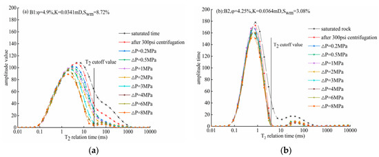 T2 spectrum curve of tight sandstone cores B1 (a) and B2 (b) in different differential pressures.