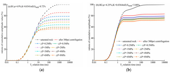 T2 spectrum accumulation curve of tight sandstone cores under different differential pressures: (a) Core B1; (b) Core B2.