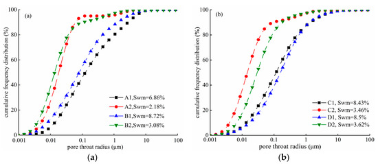 From the result of Table 2 and Figure 5, we can see that there are still large differences in the micropore-throat structure heterogeneity for the cores with similar macropermeability and porosity. For the same group of comparative cores, the higher the movable water saturation in the core, the larger the proportion of large and mesopore throats. Conversely, the lower the movable water saturation in the core, the smaller its proportion of large and mesopores. The core A1 and A2 are similar in their porosity and permeability, but the movable water saturations are 6.86% and 2.18%, respectively. According to the high-pressure mercury intrusion analysis, the proportion of macropore and mesopore in A1 reached 54%. As shown in Figure 5, when the cumulative distribution frequency of pore throat radius is 90%, the corresponding pore throat radius is 2.59 μm. By contrast, the proportion of macropore and mesopore in A2 is only 5%, and the corresponding pore throat radius is only 0.06 μm when the cumulative distribution frequency of pore throat radius is 90%. The movable water saturation in the core B1 and B2 is 8.72% and 3.08%, respectively. The proportion of macropore and mesopore in B1 reached 47%, and the corresponding pore throat radius is 1.34 μm when the cumulative distribution frequency of pore throat radius is 90%. However, the proportion of macropore and mesopore in B2 is only 10%, and the corresponding pore throat radius is only 0.149 μm when the cumulative distribution frequency of pore throat radius is 90%. Other groups of tight sandstone cores also show the same characteristics, and thus, it can be seen that the tight sandstone core with the low higher movable water saturation will have a larger the proportion of large and mesopore throats.