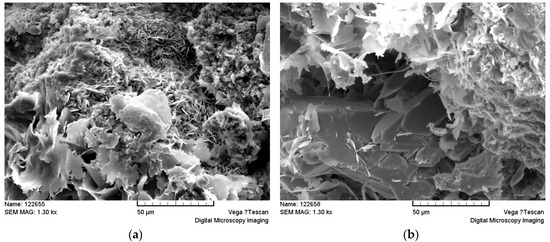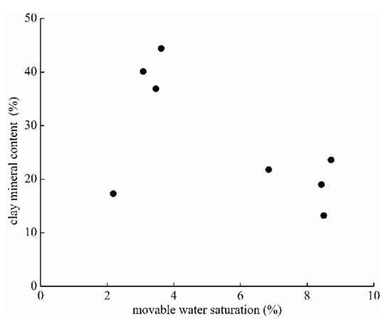 Clay mineral content versus movable water saturation in the tight sandstone cores is illustrated in Figure 8. As shown, there is a significant negative correlation between these two parameters; the higher the clay mineral content in the core, the lower the movable water saturation. This is because the movable water mainly occurs in the connected large pore throat, while the clay mineral composition in the core will have a negative effect on the pore throat size and connectivity of the reservoir. Chlorite (Figure 7a) is mainly coniferous, filled in the pore throat of the reservoir, although a small amount occurs on the surface of particles in thin film. Illite mainly occurs between the particles in the form of a crimp sheet and filiform. On the one hand, the network bridging distribution cuts a large number of pore throats into tiny bound pores, which results in the reduction of pore throat connectivity. On the other hand, after contact with groundwater, some illite will expand weakly and the filiform illite will also be dissolved and destroyed, which spreads, transfers and blocks the throat [33]. Clay minerals such as montmorillonite and mixed illite/smectite exhibit a semicellular distribution (Figure 7b). When they contact water expansion, they absorb water and expand to various degrees, which makes the pore throat of the reservoir smaller, even blocking it occasionally, resulting in a decrease in permeability [34].