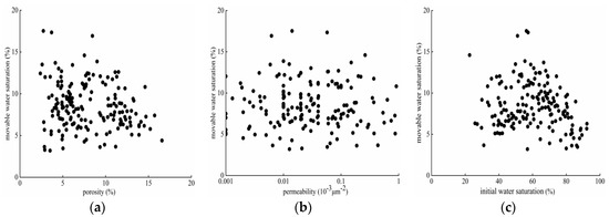 Movable water saturation versus porosity (a), permeability (b) and initial water saturation (c).