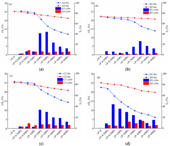 To understand the water production characteristics during the development of tight sandstone gas reservoirs, gas flooding experiments and the NMR measurement were conducted in this study. The core water saturation under different differential pressures after gas flooding is shown in Figure 10. As shown, a breakthrough point exists of critical water production during the flow of movable water, i.e., only a small part of the movable water in the macropores can flow out when it is below a critical differential pressure. When the gas flooding pressure is larger than the critical pressure difference, the water production of the core increases sharply and the gas flooding force power is more abundant. The large amount of movable water occurring in the macropores can go out, and the residual water limited by capillary force in some micropores will also be driven to flow; that is why some gas wells suddenly produce water or increase water production when the drawdown pressure is increased. In such cores, the lower the core permeability, the higher the critical gas drive pressure difference. As it is shown in Figure 10, the critical pressure differences of cores A1, B1 and C1 (K < 0.1 mD) were about 2 MPa, 3 MPa, and 2 MPa, respectively, while that of D1 (K > 0.1 mD) was only 0.5 MPa. When the gas drive pressure difference reaches the critical breakthrough point, the decrease of water saturation will decrease. Taking core D1 as an example, as shown in Figure 10d, when the pressure difference of the gas drive reached the critical breakthrough point of 0.5 MPa, the water saturation of the core decreased by 13.16%, while the water saturation of the core decreased by only 4.56% when the pressure difference increased to 8 MPa.