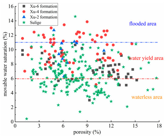 In order to understand the movable water and water production characteristics in tight sandstone gas reservoirs, more than 300 cores were selected from the Sulige gas field and the Xujiahe Formation in the Sichuan Basin, China. The movable water saturation versus porosity in tight sandstone cores is illustrated in Figure 11. As shown, there were significant differences in the distribution range of the movable water saturation in different tight sandstone gas reservoirs. In the Sulige gas field, the movable water saturation of the tight gas reservoirs was low, i.e., most of them were below 8%, with very few reservoirs ranging from 8% to 11%. The distribution range of movable water saturation in the Xu-6 gas reservoir was similar to that of Sulige gas field, while the movable water saturation in the Xu-2 and Xu-4 gas reservoirs was obviously higher than 8%, with half of them being more than 11%. The movable water saturation measured is in good agreement with the overall characteristics of tight sandstone gas reservoirs. There is little or no water production in gas wells in the central and eastern Sulige gas fields, while there is a large amount of water production in the Xu-2 and Xu-4 gas reservoirs, except for the Xu-4 gas reservoirs. Compared with the relationship between the water production and the movable water saturation, it can be seen that there is a significant positive correlation between them, as shown in Figure 12. When the movable water saturation of tight sandstone reservoirs is less than 6%, gas wells will not produce water; in contrast, when the movable water saturation of tight sandstone reservoirs is between 6% and 8%, gas wells will produce a small amount of water, and when saturation is more than 8%, gas wells will produce a large amount of water or even flood. In summary, the higher the movable water saturation in tight sandstone reservoirs, the more serious the water production in gas wells.