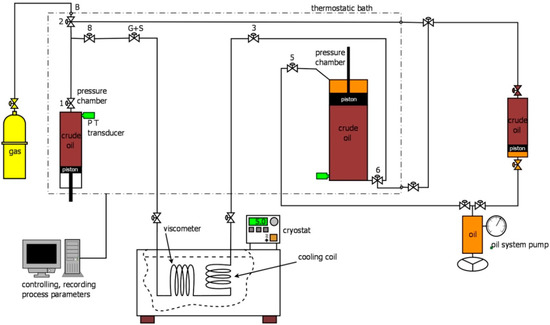 A capillary viscometer was the main element of the apparatus during the determination of initial pressure and temperature conditions for paraffin precipitation. Upgrading of the apparatus involved removing the viscometer from a thermostatic bath of the PVT apparatus and mounting it in a cryostat bath filled with an ethylene glycol solution. Additionally, the cryostat enabled precise temperature adjustment of the flowing reservoir fluid sample. A change in the placement of the viscometer allowed maintaining a constant temperature (above the WAT) of the tested crude oil sample in pressure cells of the PVT apparatus with a simultaneous ability to lower the temperature of a sample flowing through a capillary viscometer (Figure 3). Such an approach was able to eliminate the risk of deposit precipitation in the pressure cells, which could cause major mistakes in determining the conditions for the precipitation of paraffins from the tested crude oil. To study the depositional conditions of the solid paraffin phase, a crude oil from the Polish reservoir was used [22].