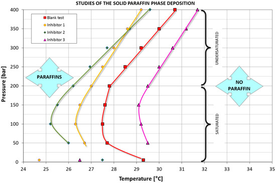 Attention should be paid to the obtained differences in the effectiveness of used agents for a dead oil sample in relation to the pressurized conditions. Inhibitor 2 turned out to be the most efficient one for dead oil, followed by inhibitor 3 and inhibitor 1. On the other hand, if an assessment of the effectiveness is made under real (pressurized conditions), this sequence undergoes a considerable change, because it turns out that the most efficient agent is the worst one for a dead oil sample, meaning inhibitor 2, followed by inhibitor 1, while inhibitor 3 was proven to be ineffective. When using inhibitor 3, the paraffin deposit appeared at a temperature higher by approximately 2 °C.