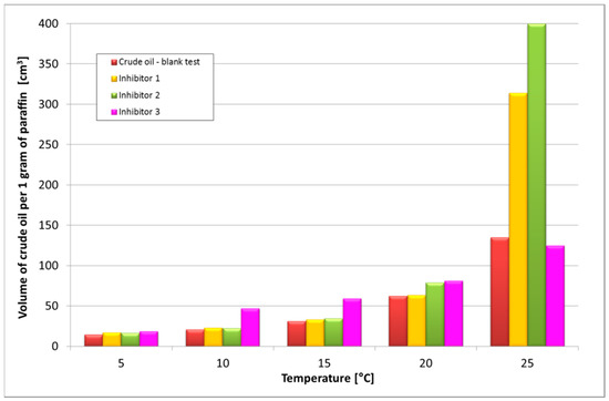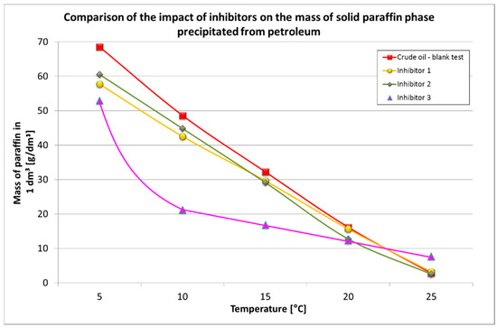 Figure 5 shows comparison of the impact of inhibitors on the WPC shape and Figure 6 shows comparison of the impact of inhibitors on the volume of oil sample needed for deposition of 1 g of the paraffins. Under the applied pressure–temperature conditions using a 5 µm filter, it was possible to filter out between 0.19 g in 25 °C and 4.79 g in 5 °C of solid paraffin phase from the pumped volume; for crude oil with an addition of inhibitors, the amount of 0.17 g in 25 °C and 4.23 g in 5 °C was separated. The deposit had a black color, a sticky and greasy consistency, and a rather intense scent—characteristics for sour crude oil from the Polish reservoir.