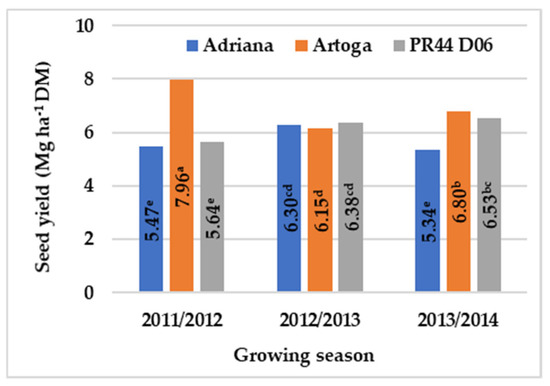 Seed yield of winter oilseed rape cultivars, across growing seasons (2011–2014). Means with the same letters do not differ significantly at p ≤ 0.05 in Tukey‘s test.
