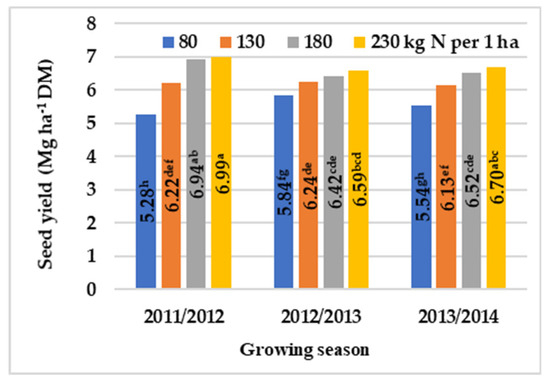 The effect of nitrogen (N) fertilization on the seed yield of winter oilseed rape, across growing seasons (2011–2014). Means with the same letters do not differ significantly at p ≤ 0.05 in Tukey‘s test.