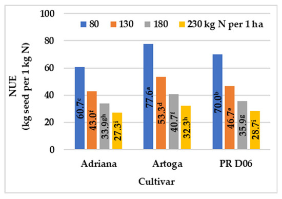 Nitrogen use efficiency of winter oilseed rape cultivars, across growing seasons (2011–2014). Means with the same letters do not differ significantly at p ≤ 0.05 in Tukey‘s test.