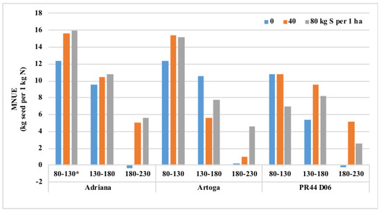 Regardless of cultivar, N rates higher than 180 kg ha−1 exerted a yield-forming effect only in combination with soil-applied S. In treatments supplied with high rates of N (180–230 kg N ha−1), an increase in the N rate by 1 kg without supplementary S fertilization was not productive in any of the studied cultivars (Figure 5).
