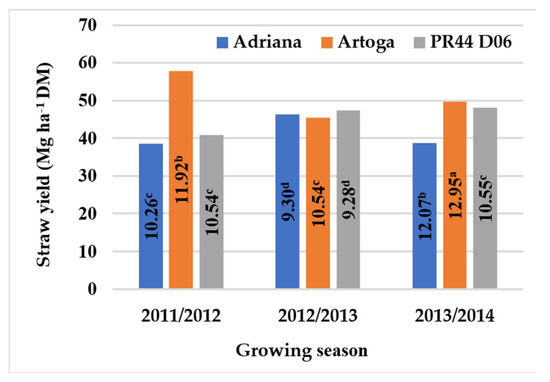 Straw yield of winter oilseed rape cultivars, across growing seasons (2011–2014). Means with the same letters do not differ significantly at p ≤ 0.05 in Tukey‘s test.