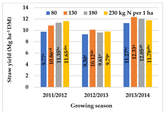 The effect of N rate on the straw yield of winter oilseed rape, across growing seasons (2011–2014). Means with the same letters do not differ significantly at p ≤ 0.05 in Tukey‘s test.