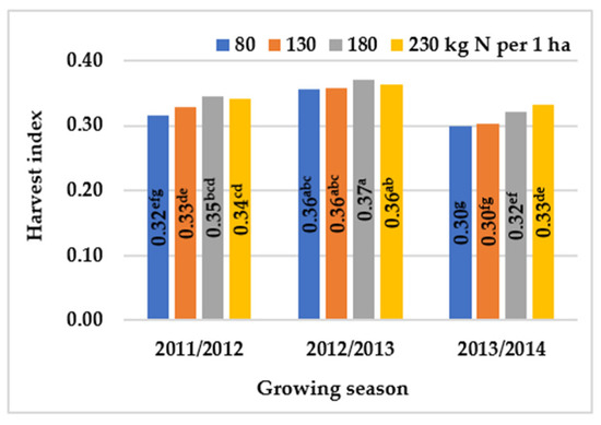 The effect of N rate on the harvest index of winter oilseed rape, across growing seasons (2011–2014). Means with the same letters do not differ significantly at p ≤ 0.05 in Tukey‘s test.
