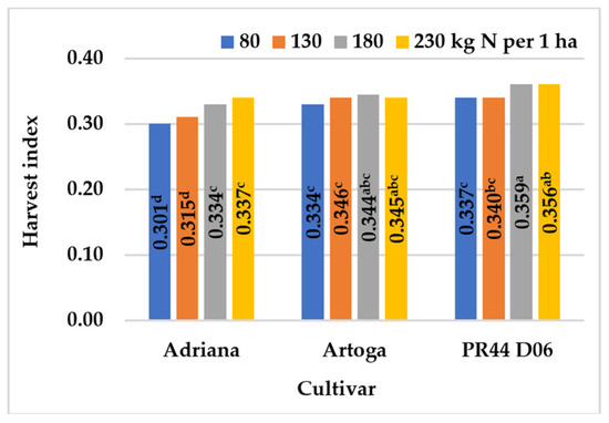 The effect of N rate on the harvest index of winter oilseed rape cultivars, across years. Means with the same letters do not differ significantly at p ≤ 0.05 in Tukey‘s test.