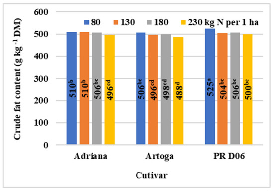 The crude fat content of seeds was higher in the open-pollinated cultivar and in the semi-dwarf hybrid cultivar (506–509 g crude fat kg−1 DM seeds). An increase in N rate decreased (by 2–5%) the crude fat content of seeds (Table 6) and the greatest decrease (5%) was noted in the semi-dwarf hybrid cultivar (Figure 10). The adverse effect of N fertilization on crude fat concentration was less pronounced when precipitation was low during the spring and summer growing seasons (year 3) (Figure 11). Spring S fertilization had no influence on the crude fat content of seeds in any of the analyzed cultivars (Table 3).