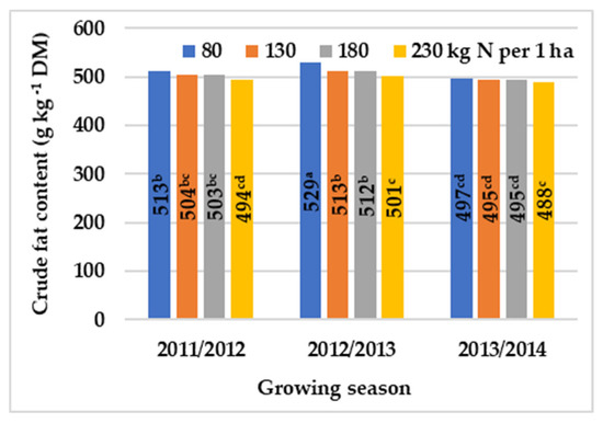 The effect of N rate on the crude fat content of winter oilseed rape seeds, across growing seasons (2011–2014). Means with the same letters do not differ significantly at p ≤ 0.05 in Tukey‘s test.