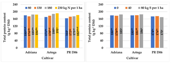 The semi-dwarf hybrid cultivar (PR44 D06) accumulated significantly less total protein (by 7.6–8.8 g kg−1 DM) than long-stem cultivars (Adriana and Artoga). Nitrogen applied in spring up to the rate of 180 kg ha−1 increased total protein concentration in the seeds of winter oilseed rape by 6% (Table 6). The effect of N and S fertilization on total protein content varied across cultivars (Cv. × N and Cv. × S interactions) (Table 3). Nitrogen contributed to a greater increase in the total protein content of seeds in hybrid cultivars (13%) than in the open-pollinated cultivar (5%) (Figure 12). Protein synthesis increased (by 3%) under the influence of S fertilization only in long-stem cultivars (Adriana and Artoga). In the semi-dwarf hybrid cultivar (PR44 D06), S fertilization decreased total protein concentration by 2% (Figure 12).