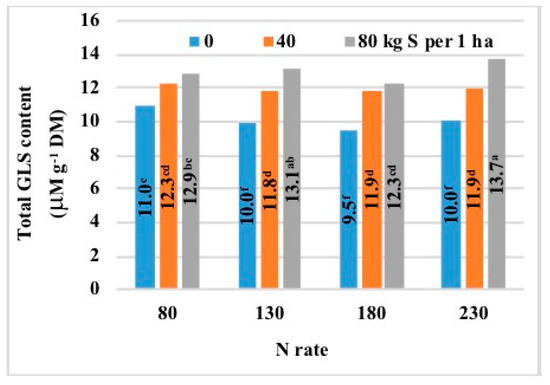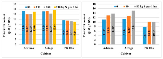 Long-stem cultivars (Adriana and Artoga) accumulated 34–39% more GLS than the semi-dwarf hybrid cultivar (PR44 D06) (Table 6). In long-stem cultivars, N rates up to 180 kg ha−1 decreased GLS content by 7–8%, whereas higher N rates increased GLS content by 7–11%. The GLS content of seeds in the semi-dwarf hybrid cultivar was not significantly modified by N fertilization (Figure 13). Sulfur fertilization rates of 40 kg ha−1 and 80 kg ha−1 increased GLS levels by 19% and 29%, respectively (Table 6). The GLS content of seeds in long-stem cultivars increased up to the S rate of 80 kg S ha−1 and it was 1.4-fold higher in the hybrid cultivar than in the open-pollinated cultivar (2.6 μM g−1 DM vs. 3.7 μM g−1 DM). In the semi-dwarf cultivar, GLS levels continued to increase up to the S rate of 40 kg S ha−1 and were 30% lower than in long-stem cultivars (Figure 13). A significant interaction of N × S fertilization was found for the GLS content of winter oilseed rape seeds (Table 3). The S-induced increase in GLS levels was enhanced by growing rates of N fertilization (Figure 14). Therefore, N fertilization exacerbated the negative effects of S fertilization on the GLS content of all studied cultivars.