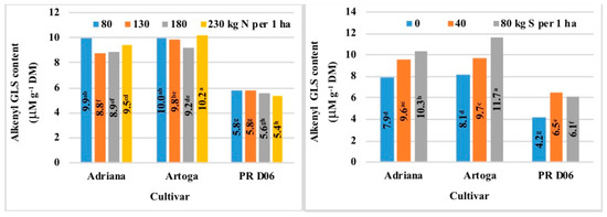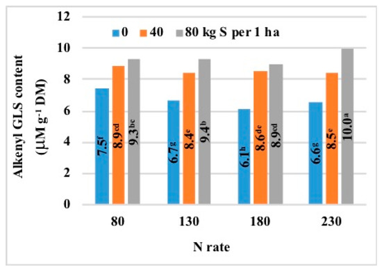 The content of alkenyl GLS in total GLS ranged from 60% in the semi-dwarf cultivar to 74–75% in long-stem cultivars. Long-stem cultivars accumulated 66–75% more alkenyl GLS than the semi-dwarf cultivar (9.3–9.8 μM g−1 DM vs. 5.6 μM g−1 DM). An increase in the N fertilizer rate to 180 kg ha−1 decreased the content of alkenyl GLS by 8% in all cultivars of winter oilseed rape (Table 6). An increase in the N fertilizer rate from 180 kg ha−1 to 230 kg ha−1 increased (by 6–11%) the content of alkenyl GLS in long-stem cultivars and induced a further drop (by 3–4%) in the analyzed parameter in the semi-dwarf cultivar (Figure 15). Sulfur fertilization rates of 40 kg ha−1 and 80 kg ha−1 increased the content of alkenyl GLS by 28% and 40%, respectively (Table 6). The increase in the S fertilizer rate from 40 kg ha−1 to 80 kg ha−1 did not cause an increase in alkenyl GLS levels only in the semi-dwarf cultivar (Figure 15). The S-induced increase in the concentrations of alkenyl GLS was further exacerbated by a rise in N rates in all cultivars (Figure 16).