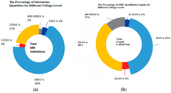 Figure 1. Substations and transmission lines (TLs) with different voltage levels in Egypt. (a) The percentage of substations quantities for different voltage levels; (b) the percentage of overhead line (OHL) installation lengths for different voltage levels [28]. - Due to its low nominal voltage, the corresponding basic insulation level (BIL) for its components is also relatively low, and hence, the study of overvoltage due to lightning extremely becomes important.