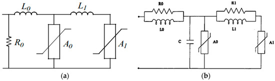 The SAs can be represented by two methods: simplified IEEE prepared by Pinceti Model and IEEE frequency-dependent model as shown in Figure 3a,b, respectively [36]. The frequency-dependent model for the SAs in the system was used in this study. As shown in Figure 3b, the two nonlinear resistors A0 and A1 are separated by an RL (resistor and inductor) filter. This filter is represented by inductance L1 and resistance R1 [37]. The impedance of the RL filter during a fast front surge is higher than its impedance during the slow front surge. So, more current flows in the nonlinear resistor A0 than in A1 during lightning strikes [2,36]. The inductance of the magnetic fields in the vicinity of the arrester is presented by L0. The resistance R0 is used as the stabilizing of the numerical integration for the computer program, while capacitor C is the terminal-to-terminal capacitance of the arrester. The most important characteristics of these models are that their parameters are calculated from electrical data. The details of surge arrester frequency-dependent model parameters are presented in Equation (3):