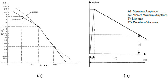 (a) CIGRE and IEEE stroke current probability curves, first stroke negative downward flash [7,23]; (b) simplified current source of the lightning surge [23,35].