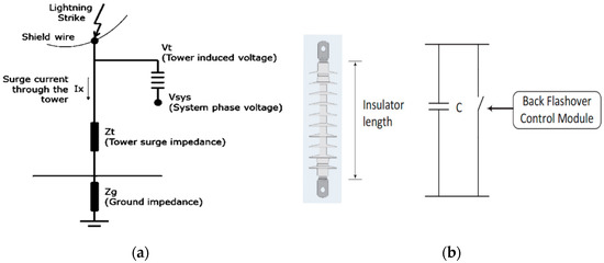 Back-flashover occurs when the strike current travels to earth though tower surge impedance and tower footing grounding impedance as shown in Figure 7a. The Back-flashover event is represented by a bypass switch (Control Module) in parallel with the insulator capacitance as shown in Figure 7b [2].