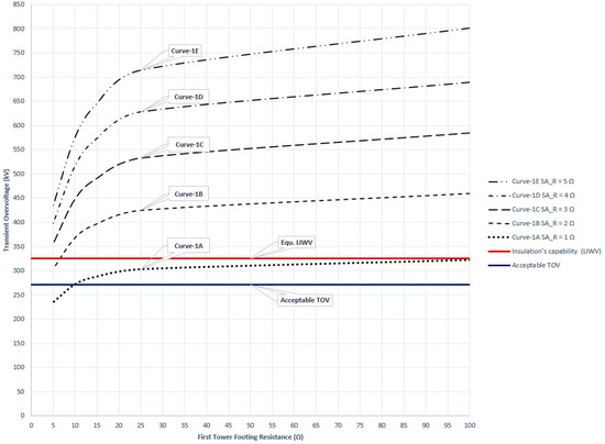 The propagation of lightning surge is analyzed with the variation of tower footing resistance in [6]. The value of footing resistance was varying between 4–35 Ω, while the proper design for the tower footing resistance was found to be maintained between 5–6 Ω to avoid the electrical stresses on both the power line insulation and surrounding structures [6]. Preventing the back-flashover on tower insulators by controlling the towers’ footing resistance is studied in [4,5,6].